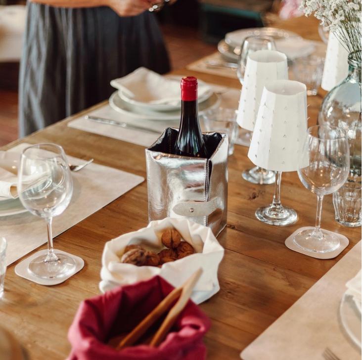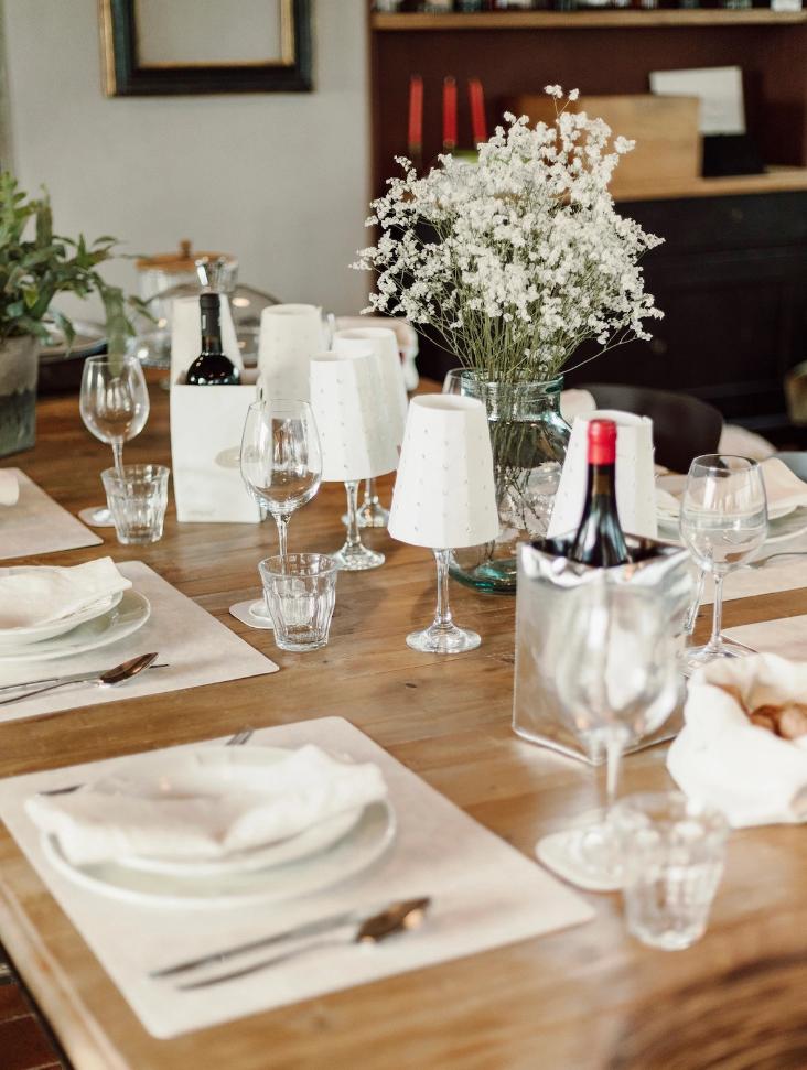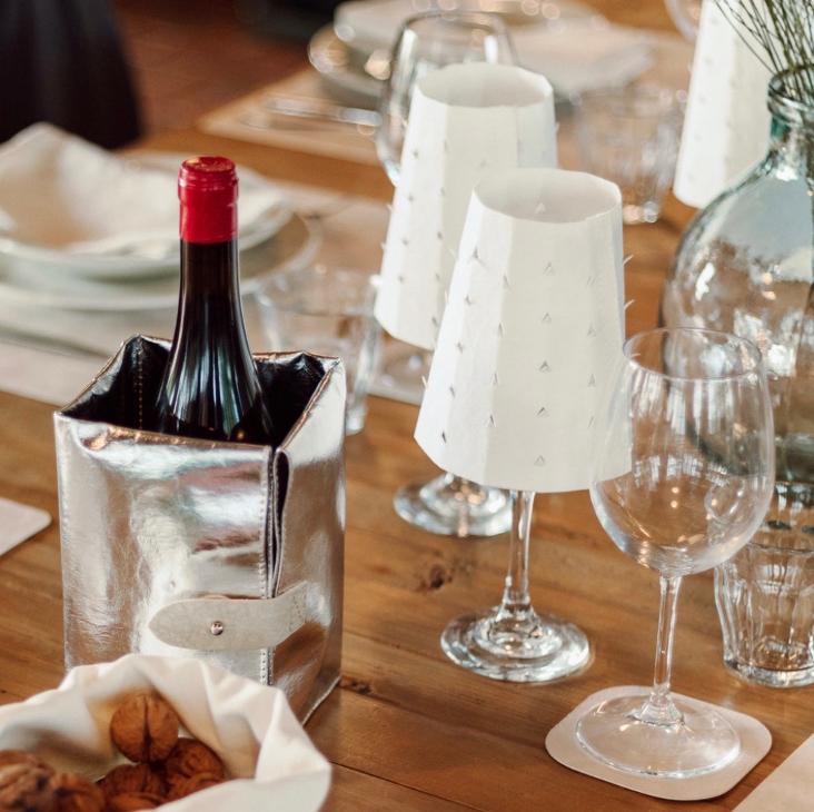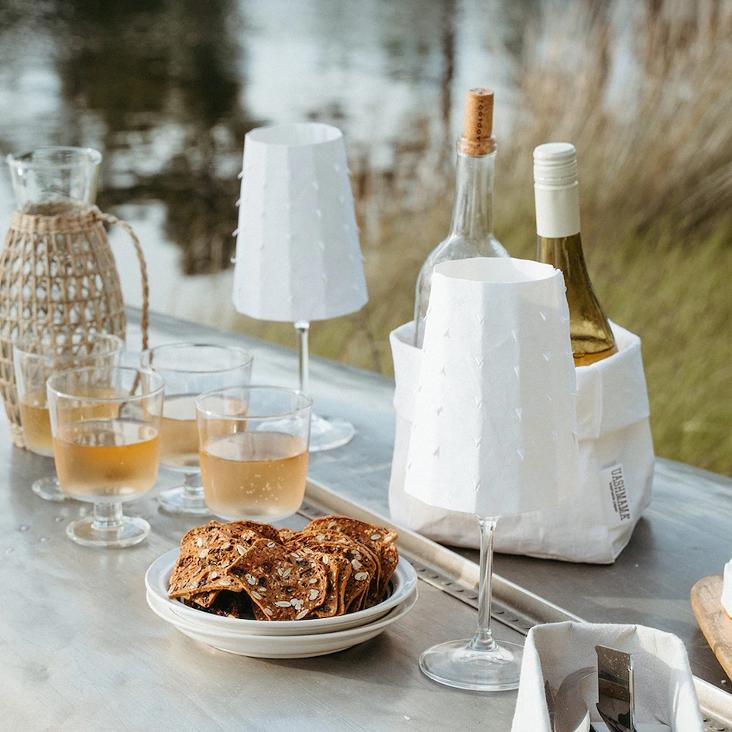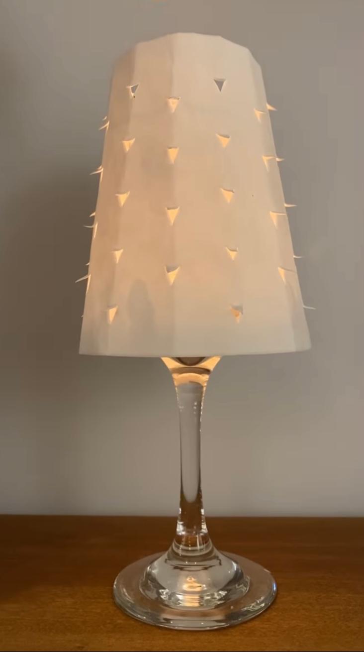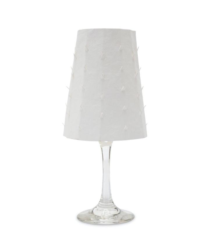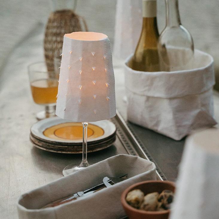 Positioniere den Lampenschirm aus waschbaren Papier über ein Weinglas und zünde darin ein kleines Teelicht an.