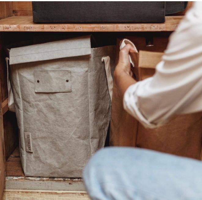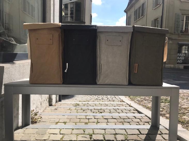 Die Bags verfügen über einen stabilen Papierdeckel mit Klettverschluss und Griffe aus recycelter Baumwolle. Sie können mehrere Recyclingbeutel mit ihrem ineinandergreifenden Druckknopfsystem kombinieren.